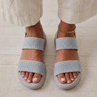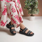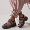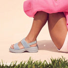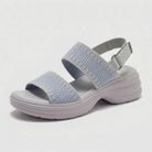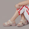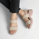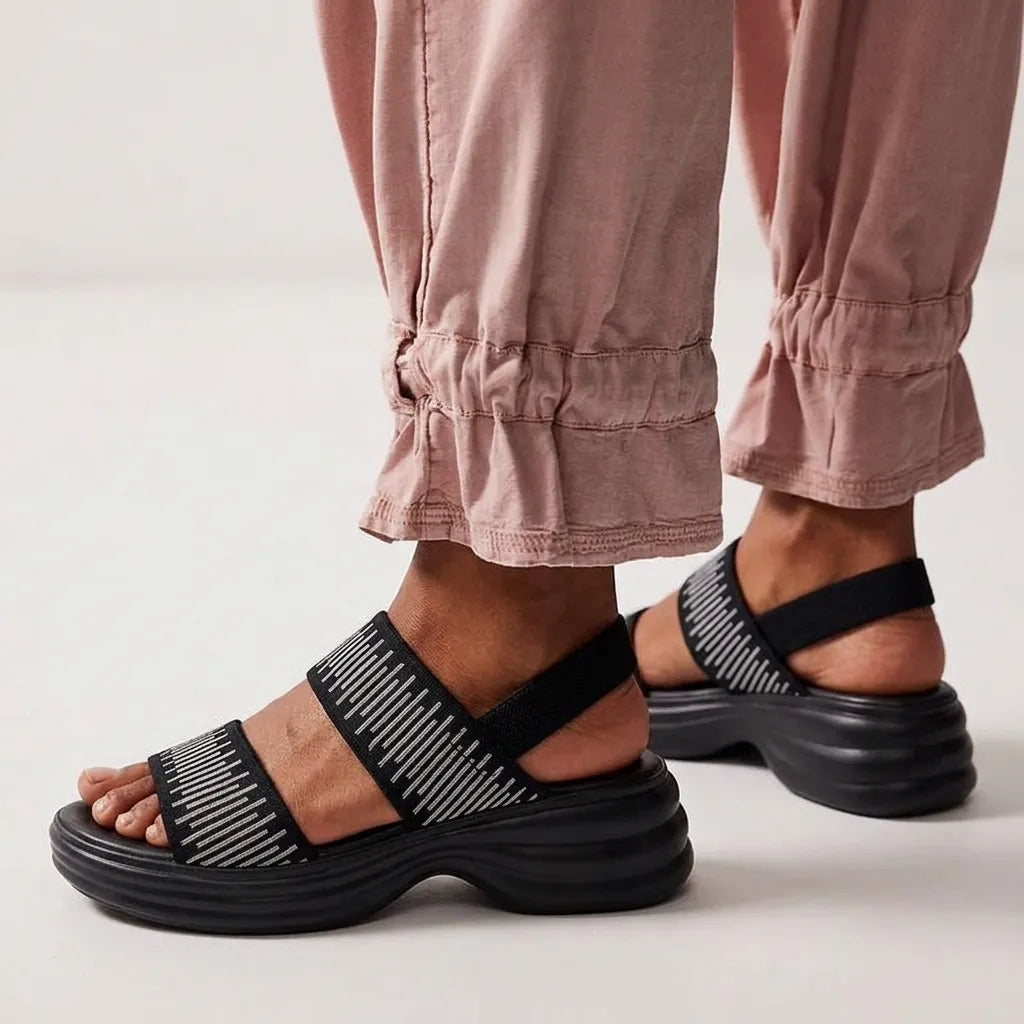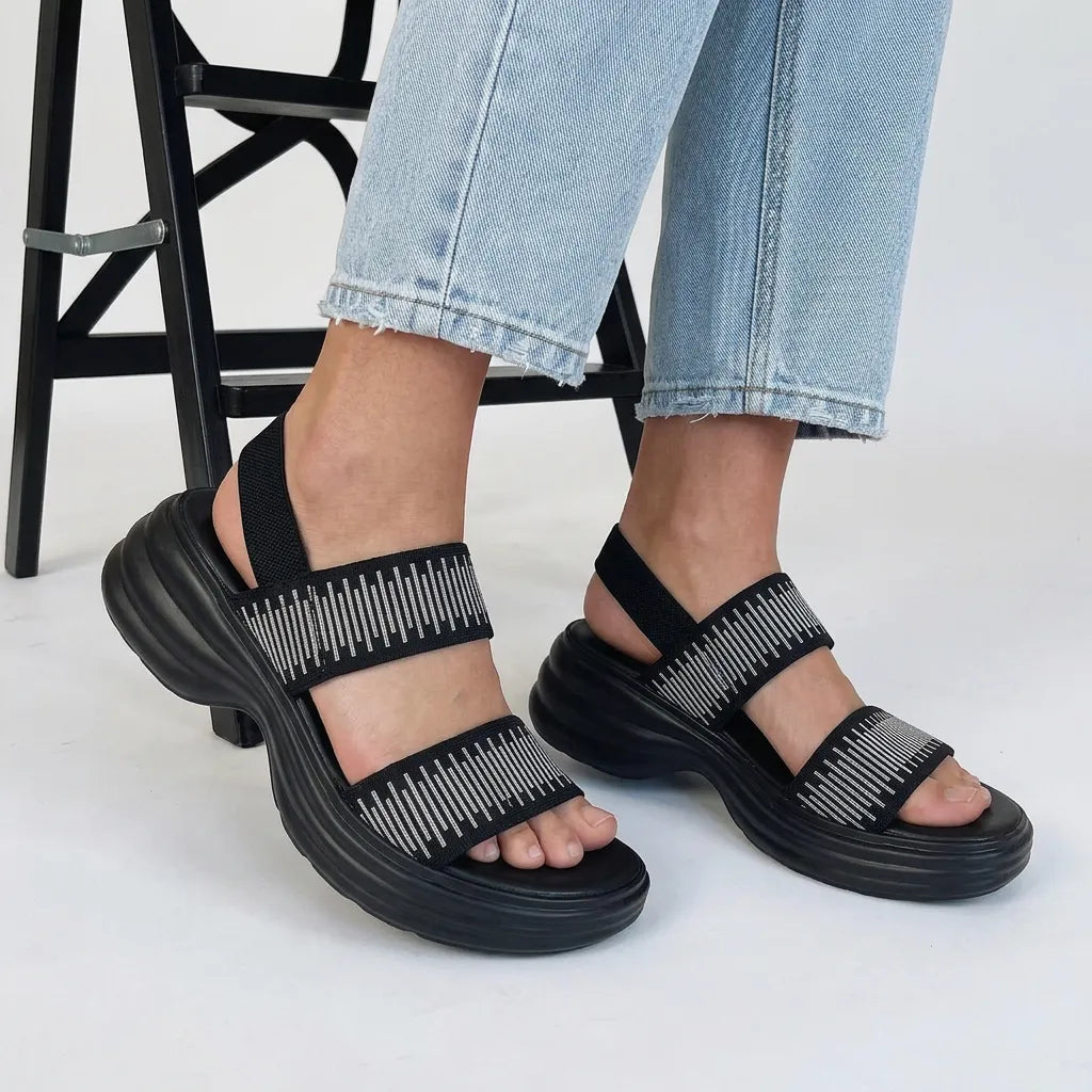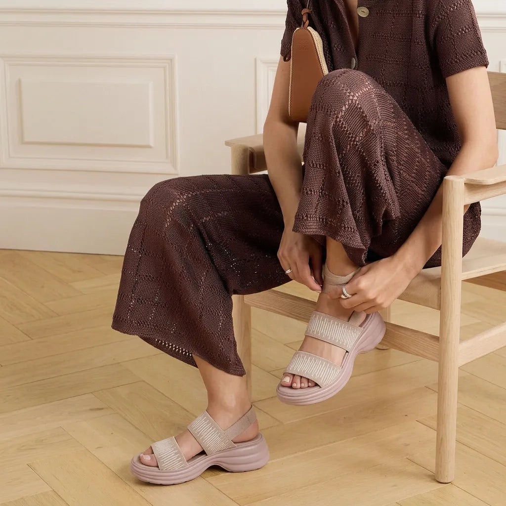 Premium Material: Upper: Breathable stretch-knit fabric straps Insole: Ergonomic cushioned comfort footbed Midsole: Lightweight EVA shock-absorbing rocker platform Outsole: Anti-slip textured grip sole Closure: Adjustable back strap for secure fit