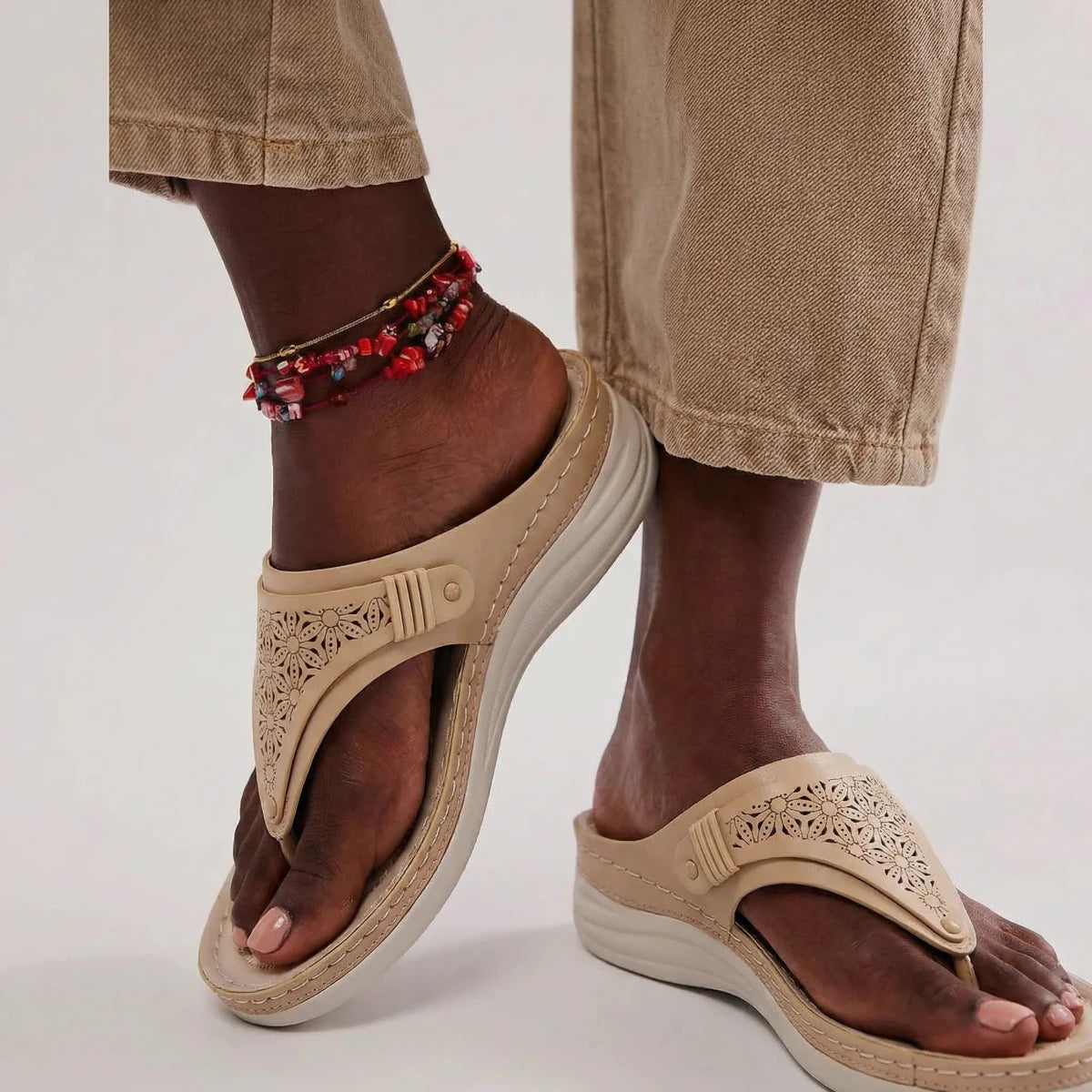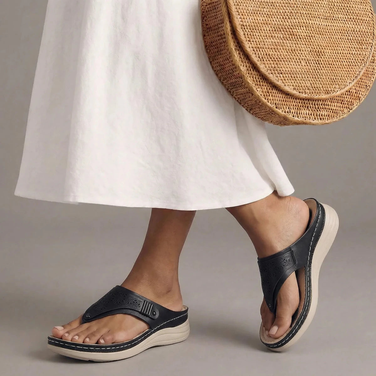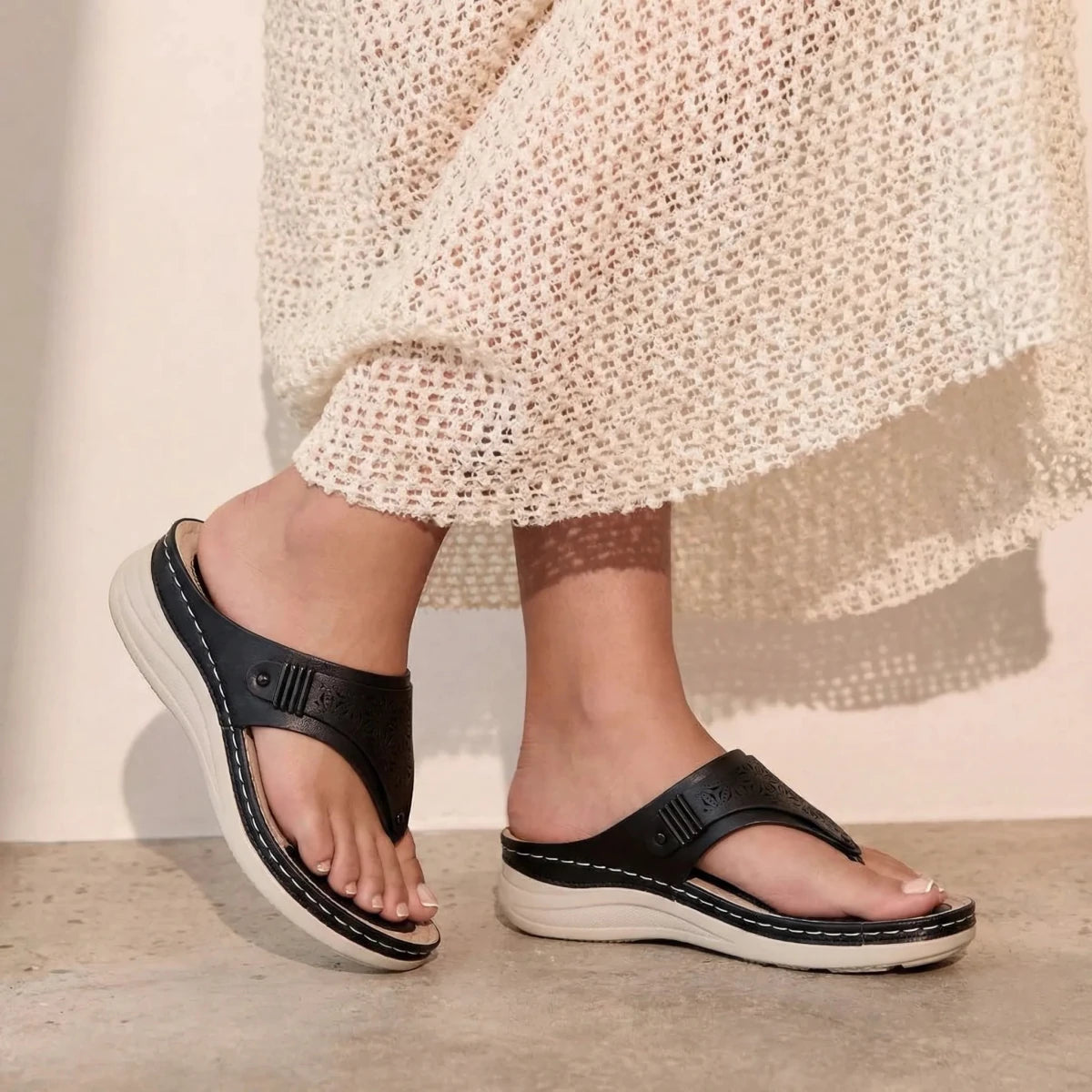 I usually avoid sandals with a toe post, but these are surprisingly comfortable. The cushioning makes a big difference and my feet don’t feel sore after hours of walking. The wedge gives a nice lift without feeling unstable. I love that they look feminine while still feeling supportive. Definitely my go-to sandals this season.
