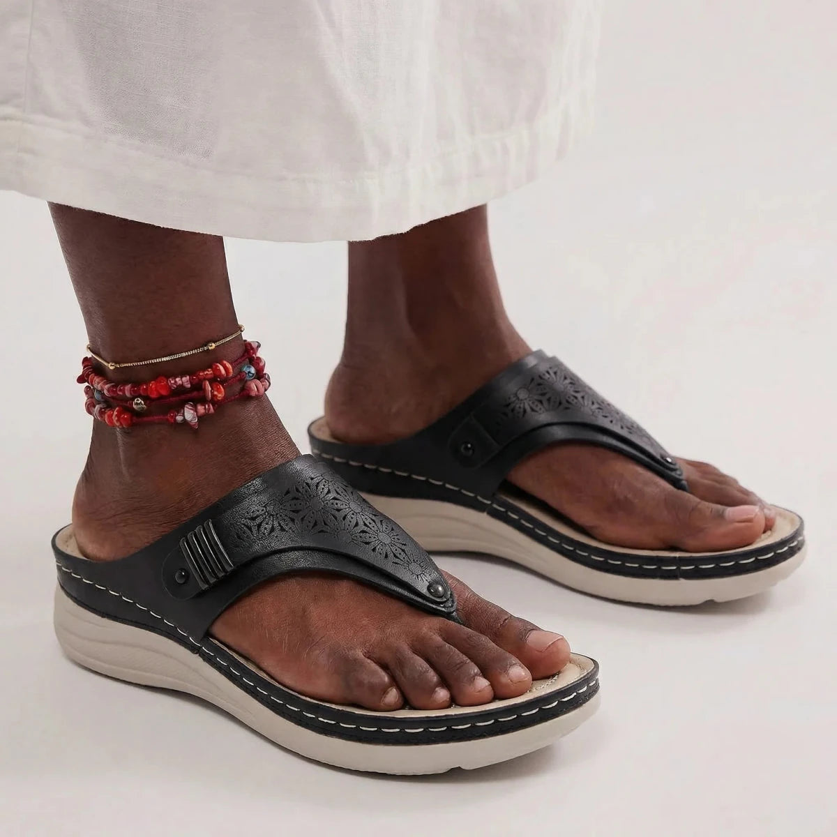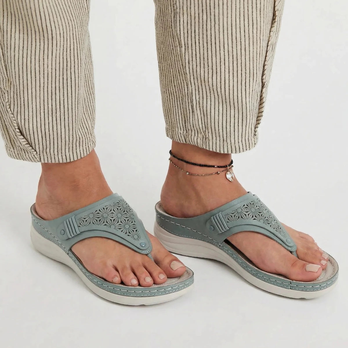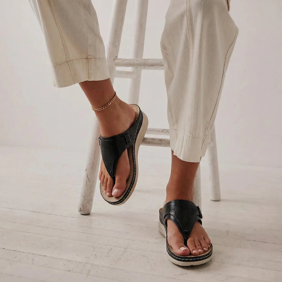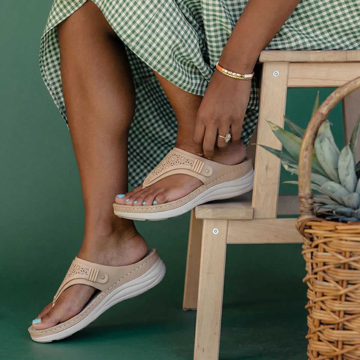 I usually avoid sandals with a toe post, but these are surprisingly comfortable. The cushioning makes a big difference and my feet don’t feel sore after hours of walking. The wedge gives a nice lift without feeling unstable. I love that they look feminine while still feeling supportive. Definitely my go-to sandals this season.